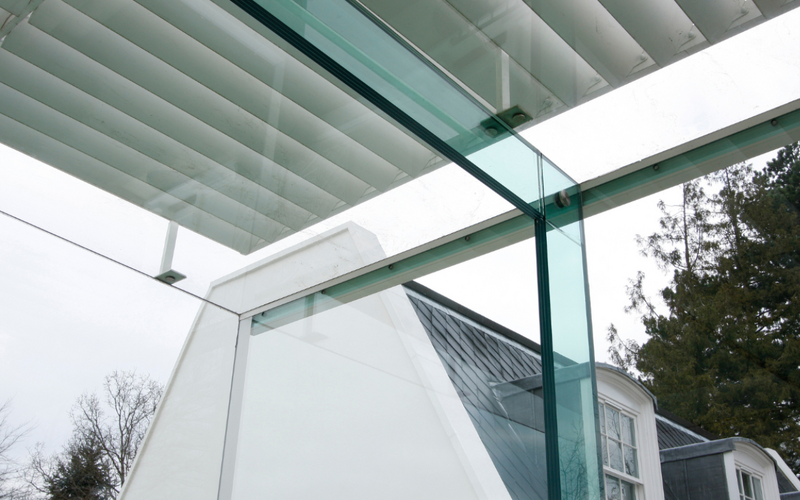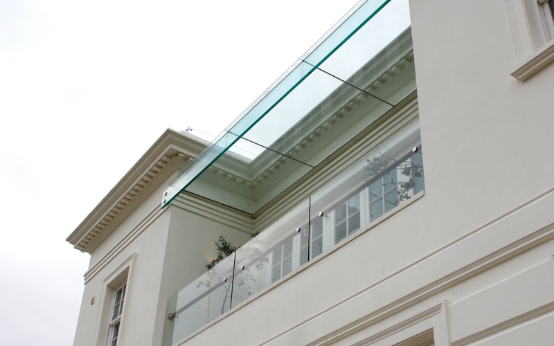 The well-used balcony space was covered with a structural frameless roof, supported with a bolted glass beam. Frameless balustrades are used across the front of the balcony with a wooden handrail bolted through the glass.
